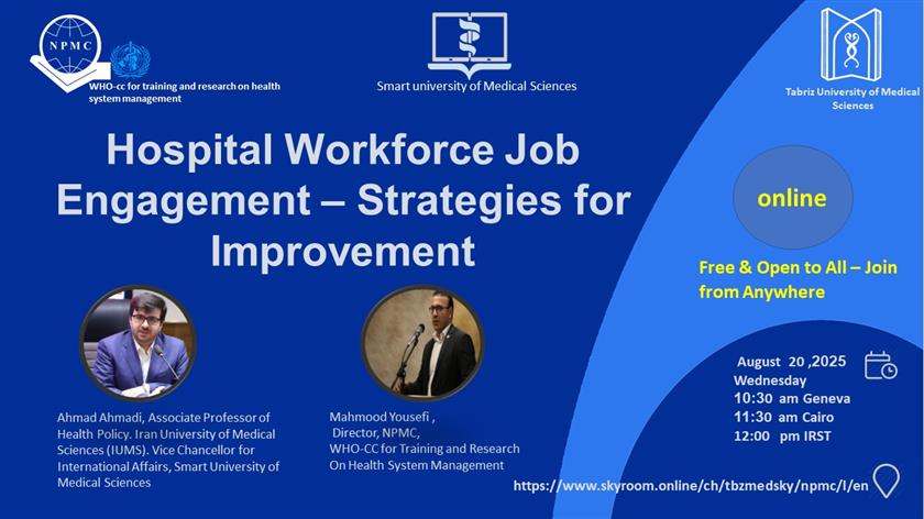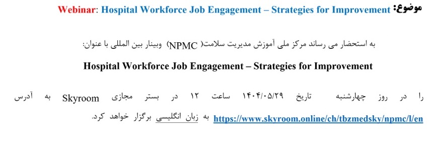 وبینار آموزشی بین المللی Hospital Workforce Job Engagement – Strategies for Improvement ۲۹ مرداد ۱۴۰۴ | ۱۰:۰۱ کد : ۵۳۹۲۵ اطلاعیه ارسال به دیگران نام شما ایمیل شما ایمیل دریافتکننده ارسال انصراف تعداد بازدید:۱۳۹۶ وبینار آموزشی بین المللی Hospital Workforce Job Engagement – Strategies for Improvement