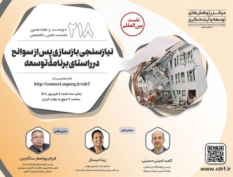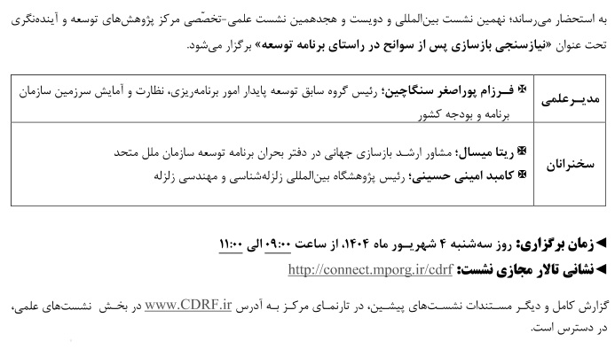 نشست علمی نیاز سنجی بازسازی سوانح در راستای برنامه توسعه ۰۳ شهریور ۱۴۰۴ | ۱۲:۳۷ کد : ۵۴۰۰۰ اطلاعیه ارسال به دیگران نام شما ایمیل شما ایمیل دریافتکننده ارسال انصراف تعداد بازدید:۱۲۸۰ نشست علمی نیاز سنجی بازسازی سوانح در راستای برنامه توسعه، توسط مرکز پژوهش های توسعه و آینده نگری برگزار می گردد.