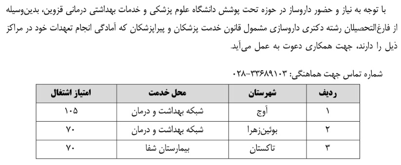 جذب نیروی داروساز مشمول قانون خدمت ۲۵ آذر ۱۴۰۴ | ۰۹:۰۰ کد : ۵۷۰۵۷ اطلاعیه ارسال به دیگران نام شما ایمیل شما ایمیل دریافتکننده ارسال انصراف تعداد بازدید:۵۲۰ جذب نیروی داروساز مشمول قانون خدمت در دانشگاه علوم پزشکی قزوین