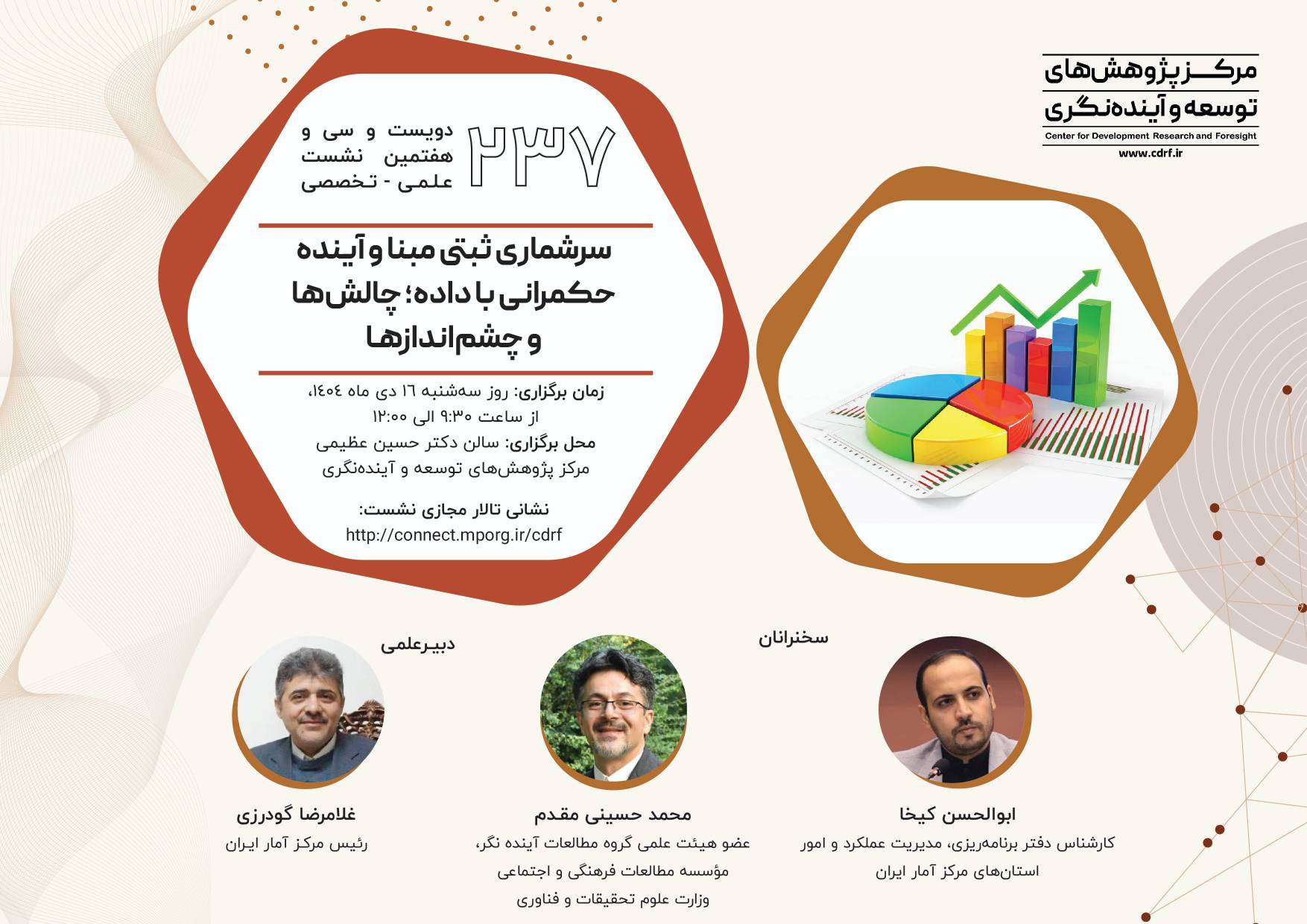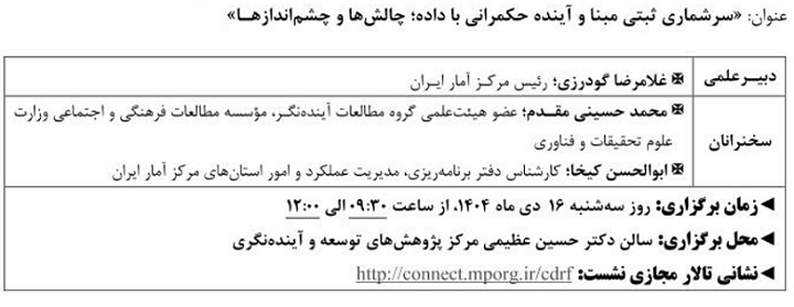 نشست علمی سرشماری ثبتی مبنا آینده حکمرانی با داده ۱۴ دی ۱۴۰۴ | ۱۰:۲۱ کد : ۵۷۴۱۸ اطلاعیه ارسال به دیگران نام شما ایمیل شما ایمیل دریافتکننده ارسال انصراف تعداد بازدید:۷۹۱ دویست وسی وهفتمین نشست علمی - تخصصی با عنوان سرشماری ثبتی مبنا آینده حکمرانی با داده، چالش ها وچشم اندازها