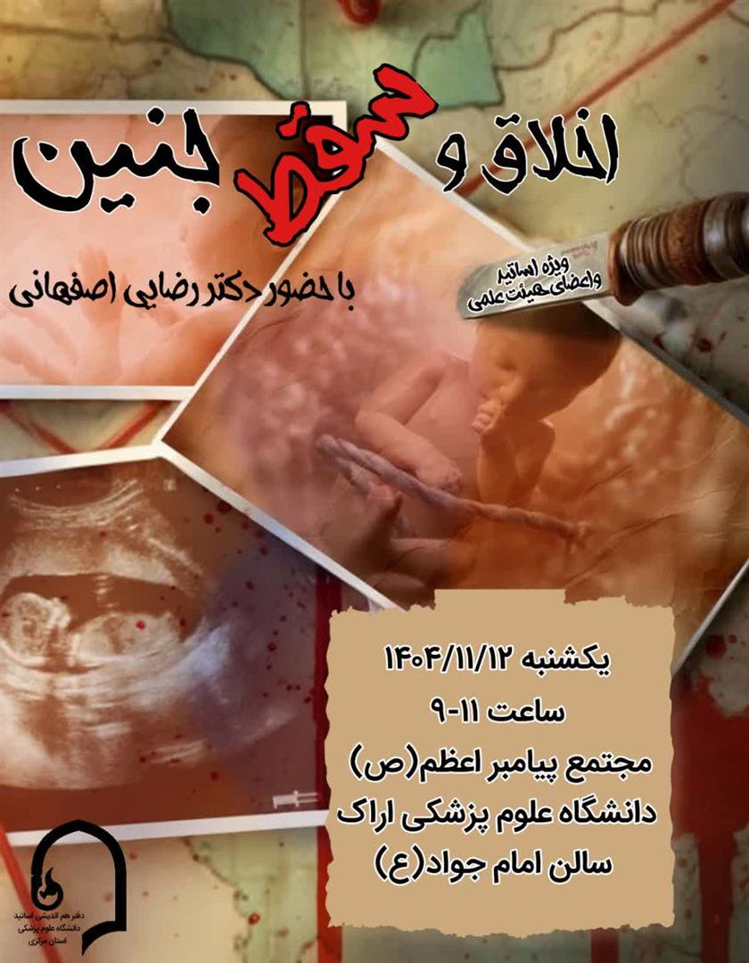 به اطلاع اساتید و اعضای هیات علمی می رساند، جلسه اخلاق و سقط جنین، در روز یکشنبه، مورخ 12/ 11/ 1404 از ساعت 9 الی 11 صبح، در مجتمع دانشگاهی پیامبر اعظم (ص) دانشگاه علوم پزشکی اراک، برگزار می گردد.