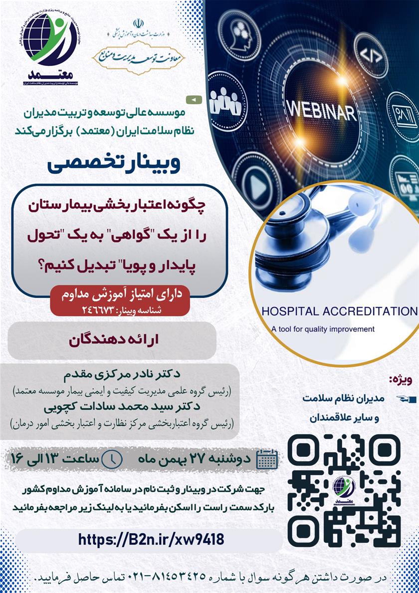 وبینار تخصصی "چگونه اعتباربخشی بیمارستان را از یک "گواهی" به یک "تحول پایدار و پویا" تبدیل کنیم؟ ۲۶ بهمن ۱۴۰۴ | ۱۲:۱۴ کد : ۵۸۰۱۱ اطلاعیه ارسال به دیگران نام شما ایمیل شما ایمیل دریافتکننده ارسال انصراف تعداد بازدید:۶۰۵ برگزاری وبینار تخصصی "چگونه اعتباربخشی بیمارستان را از یک " گواهی" به یک " تحول پایدار و پویا " تبدیل کنیم؟